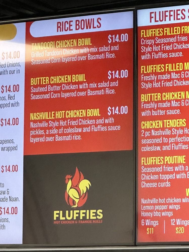 Fluffies Hot Chicken & Frankie Rolls, located in Hackensack, NJ, offers a variety of mouthwatering chicken sandwiches, signature dishes, and rice bowls. The menu features options like Buttermilk Biscuit Sandwich, Fluffies Filled Mac, and Tandoori Chicken Rice Bowl. Customers rave about the fresh and flavorful chicken, top-tier sauces, and the bold flavors infused in every dish. The atmosphere is vibrant and modern, with friendly and efficient service. The restaurant is perfect for group gatherings and dinner outings, with the option for takeout and catering. Fluffies Hot Chicken & Frankie Rolls truly stands out for its delicious food and welcoming ambiance.